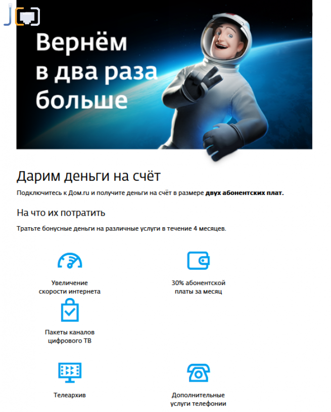 Всем новым абонентам Дом.ru при подключении с августа возвращаем на счет в два раза больше денег! Выбирайте оптимальный пакет для себя, семьи и дома, подключайтесь и получите обратно на счет деньги в размере двух абонентских плат.